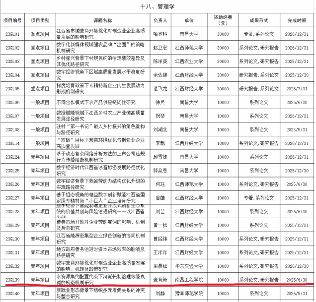 近日,江西省社会科学规划办公室发布《关于印发2023年江西省社会科学基金立项项目的通知》,我院查育新博士申报的题为“水资源集约配置约束下河湖长制治理效能衰减的规避机制研究”课题喜获青年项目立项。据悉,我校共有8项课题获得省社科基金立项。